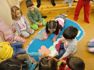 Acompanhados por esta música entrámos para uma sala onde estava uma coisinha enrolada, era um tapete. O senhor abriu o tapete. Uaaaau!!! Era tão giro, era o fundo do mar, azul e verde, com rochas e plantas... Começou a contar uma história, com uns peixinhos (pequeno, grande, muito grande, maior), com o tapete e com mais uns sons à mistura.
